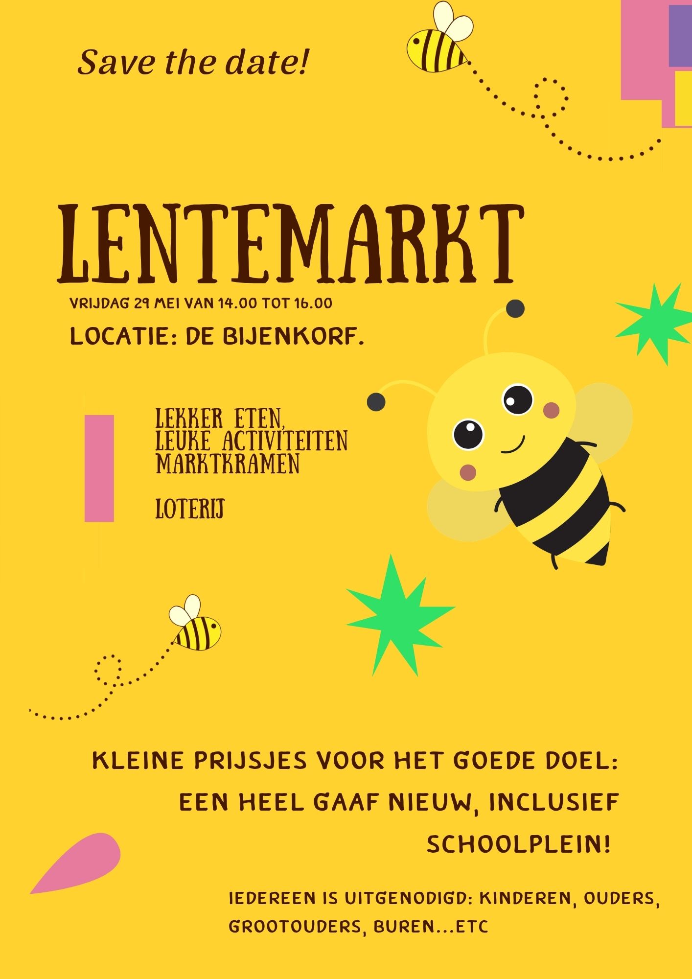 Graag nodigen wij jullie allemaal uit voor de Lentemarkt op vrijdag 29 mei van 14.00 tot 16.00 uur.